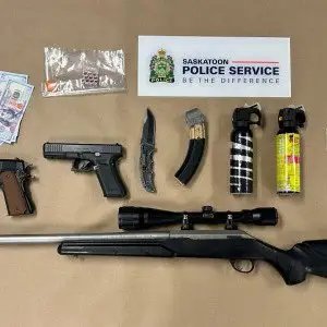Four people are facing a total of 20 charges following a traffic stop that led to the seizure of weapons, drugs and counterfeit currency, according to Saskatoon police.