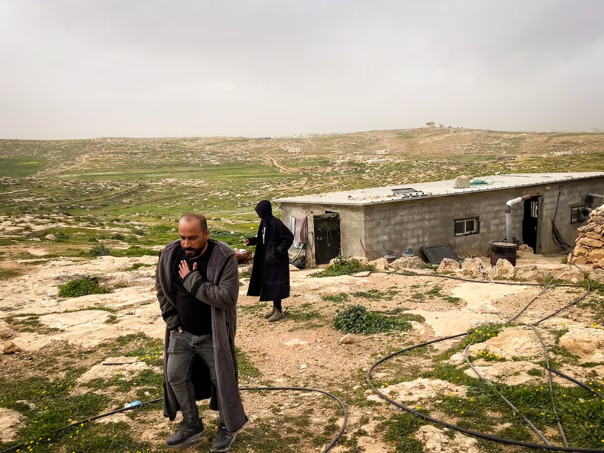 That is why he has called the press together (through a message circulated by Abraham) at his modest family home — with unpainted cement walls and an aluminum roof — in Susya, one of the hamlets that make up Masafer Yatta. The bucolic setting, with the first hints of spring green and birdsong, contrasts sharply with the nearness of danger. Just a few dozen meters away, three settlers from the nearby radical settlement (which is also called Susya and known for its history of violence) watch closely. Moments earlier, they had honked aggressively at a car climbing the rocky, uneven path too slowly, making it clear that they are the ones in charge here. Israeli fighter jets pass overhead every so often, filling the air with an unsettling hum.