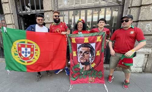 Una familia de portugueses, con banderas de Cristiano Ronaldo, arribó a la capital del país para disfrutar hoy del partido México contra Portugal, y presenciar la inauguración del estadio Banorte.