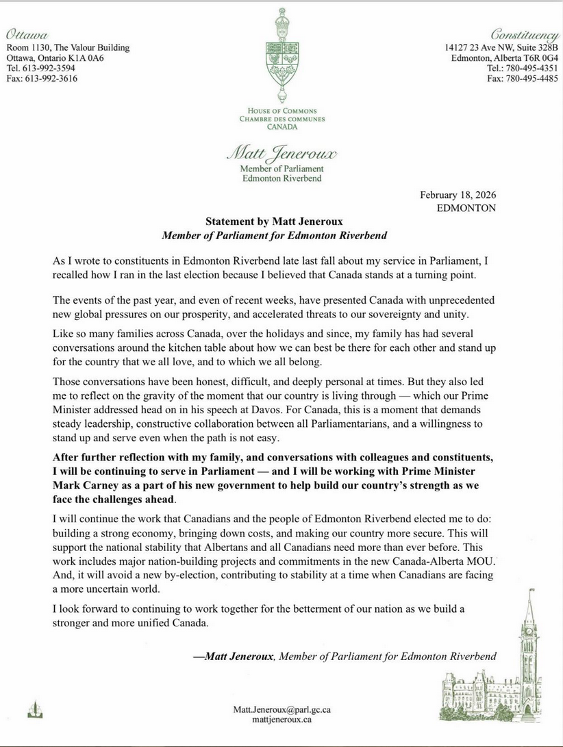 Mr. Jeneroux made the announcement in a letter published on social media in which he said after listening to Mr. Carney’s world-famous Rupture Address in Davos last month he had concluded we are living through a moment “that demands steady leadership, constructive collaboration between all Parliamentarians, and a willingness to stand up and serve even when the path is not easy.”