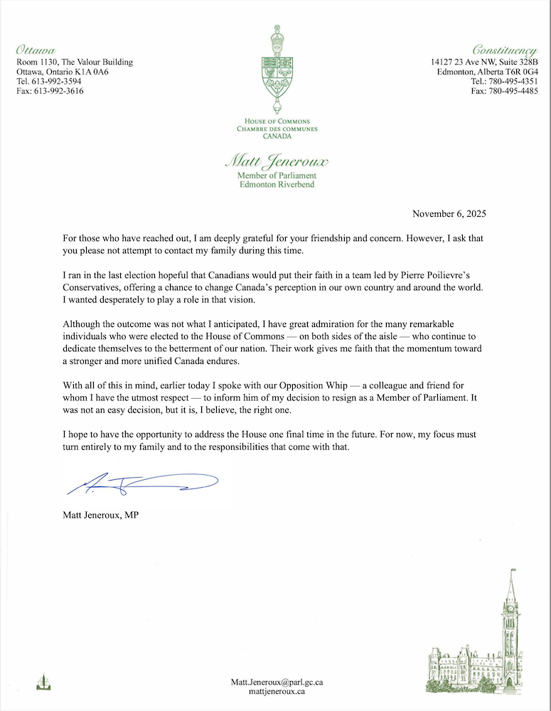 In a social media statement, Prime Minister Carney added that he was “honoured to welcome Matt Jeneroux to our caucus as the newest member of Canada’s new government. Building a stronger, more resilient, and more independent country will require ambition, collaboration, and occasionally, sacrifice.”