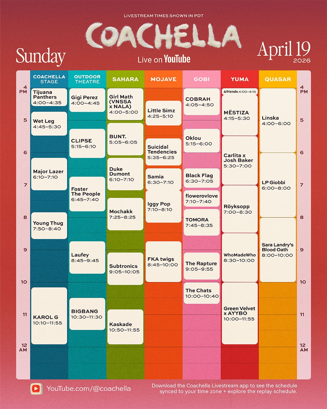Esta también es tu última oportunidad de ver cualquier actuación que quizás te hayas perdido. La semana pasada me perdí Clipse, Young Thug, The Rapture y Tomora, así que son mi prioridad. Pero también espero con ansias a Röyksopp, que no apareció en la transmisión el fin de semana pasado. Dirígete al canal oficial de YouTube de Coachella.