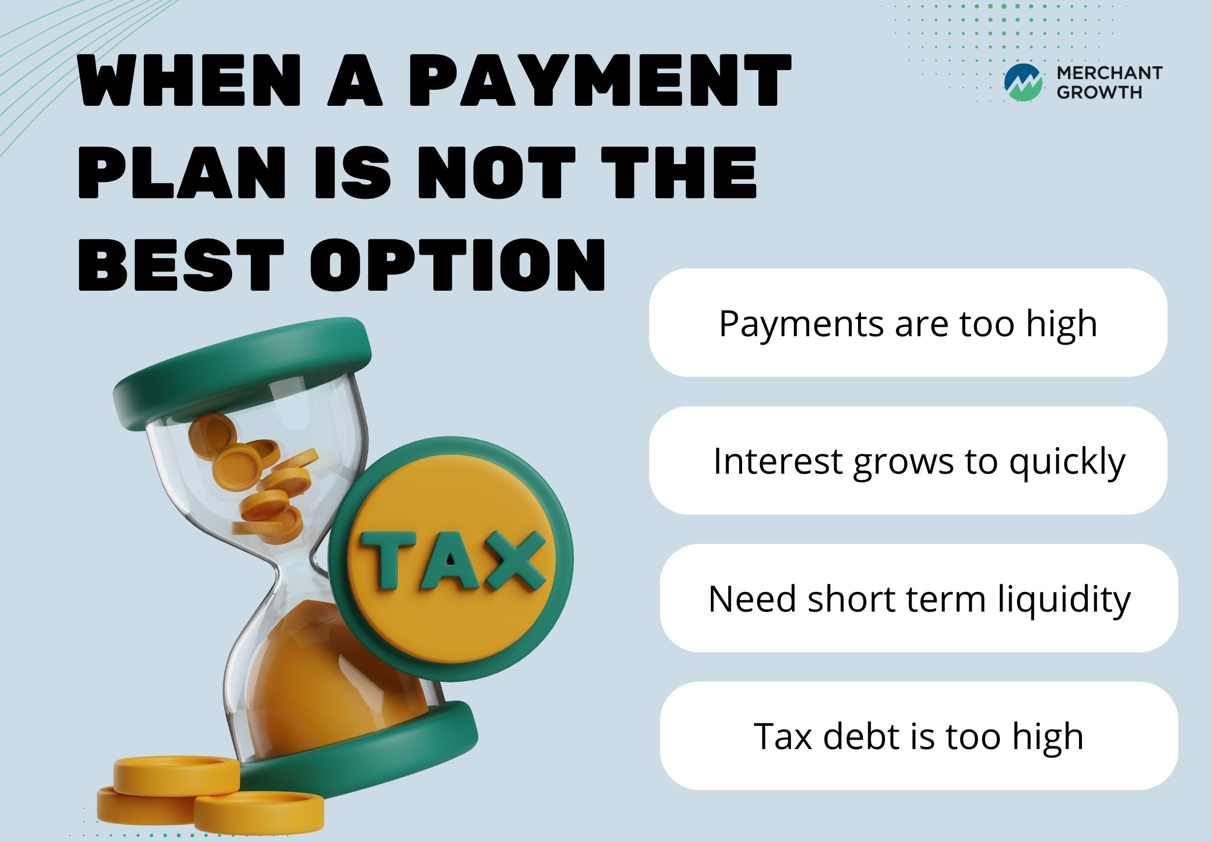In these situations, a payment plan can quietly make things worse instead of better. If your business is struggling to survive, locking into payments that drain your remaining cash may only accelerate the problem.