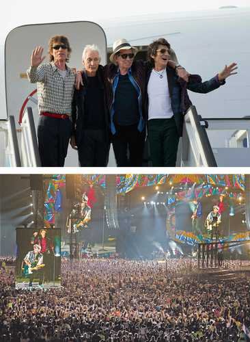 ▲ La banda británica en el aeropuerto internacional José Martí de La Habana, el 24 de marzo de 2016, y durante su presentación en la explanada de la Ciudad Deportiva.Foto Ap
