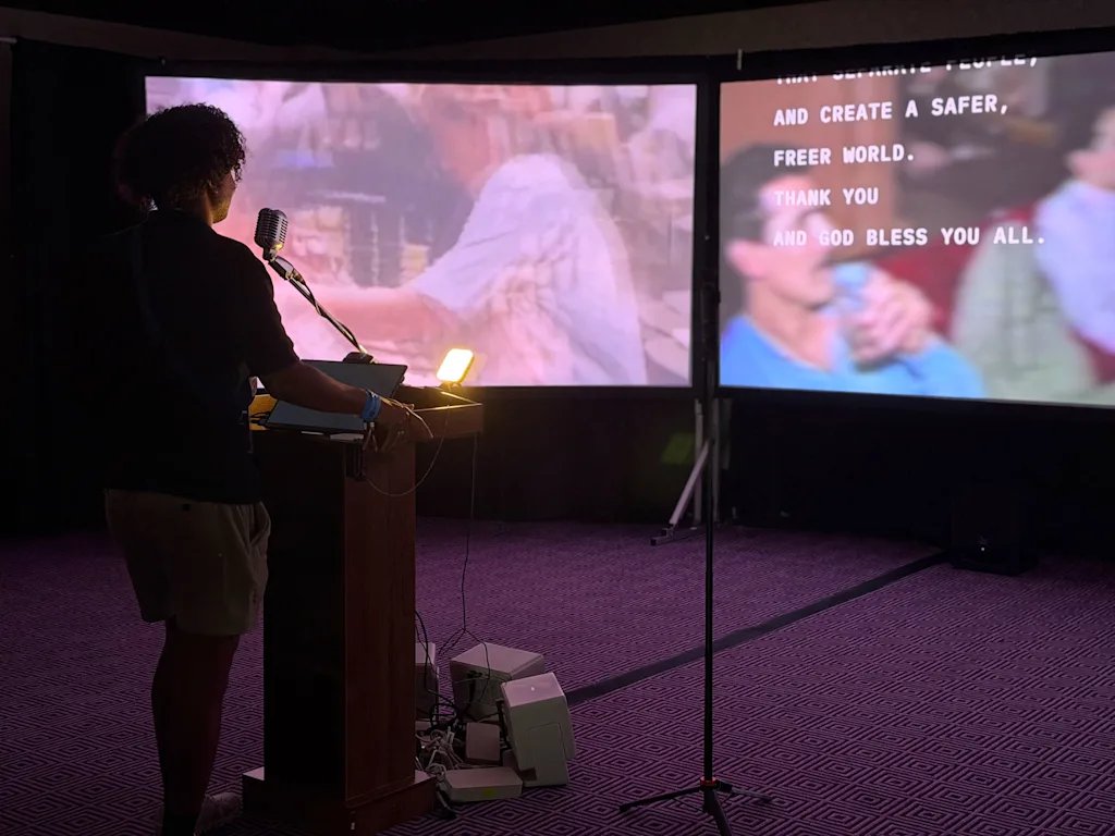 At a hotel in downtown Austin, attendees step up to a podium flanked by three large screens cycling archival footage. After consenting for their voice and likeness to be used, the person then chooses one of three speeches from three very different eras: Malcolm X’s 1964 “The Ballot or the Bullet” speech in Cleveland, Ronald Reagan’s 1987 “Tear down this wall” speech in Germany, and Zohran Mamdani’s 2024 victory speech in New York City.