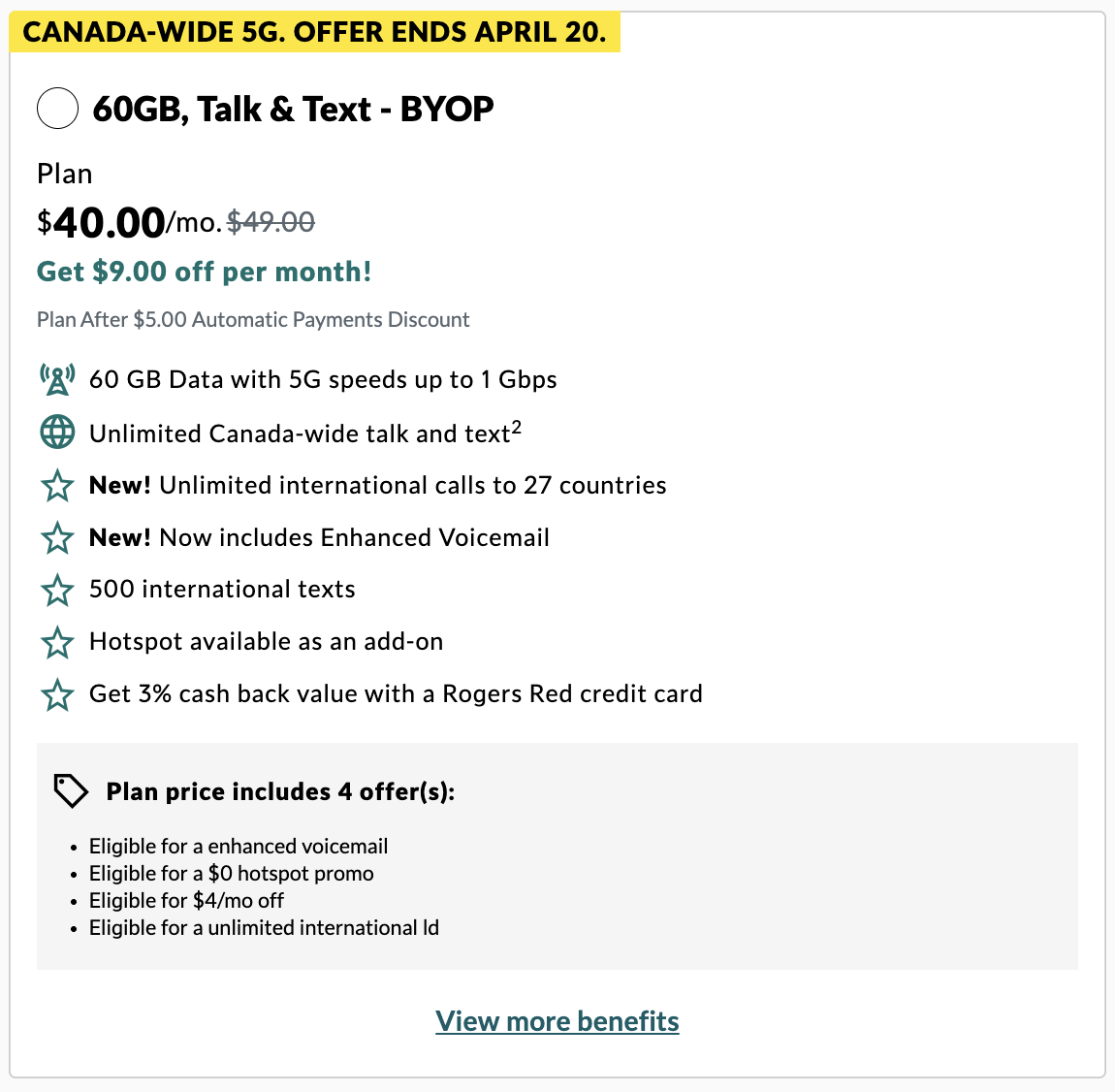 The Rogers-owned wireless brand removed its $39/20GB and $44/60GB plans and replaced them with a $40/60GB plan that’s only available for a few more days. Fido also has a $49/80GB plan that includes U.S. and Mexico roaming. This doesn’t have a limited time label, though.