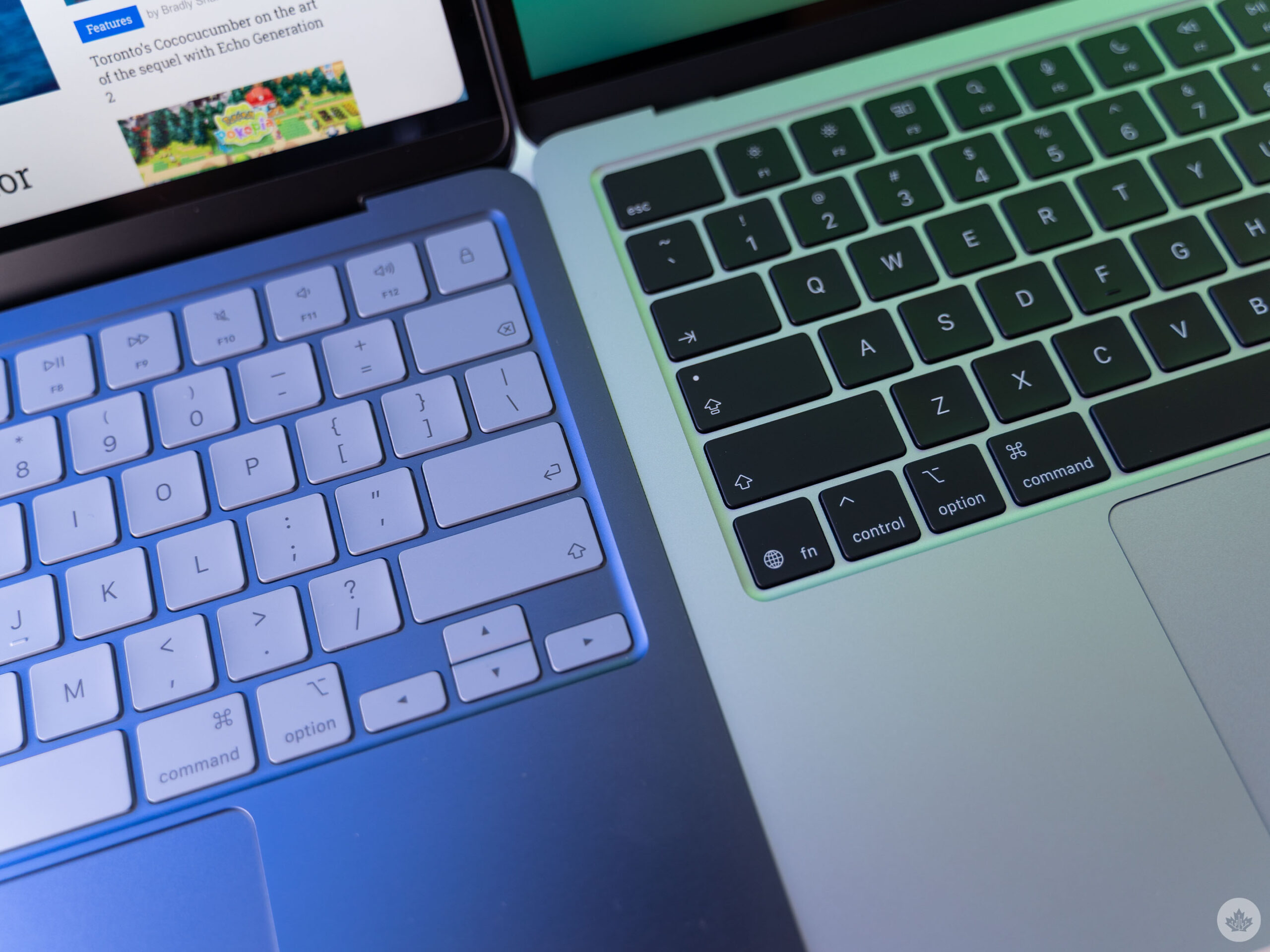 Closer look at the colour-matched keyboard on the MacBook Neo (left) versus the Air (right).