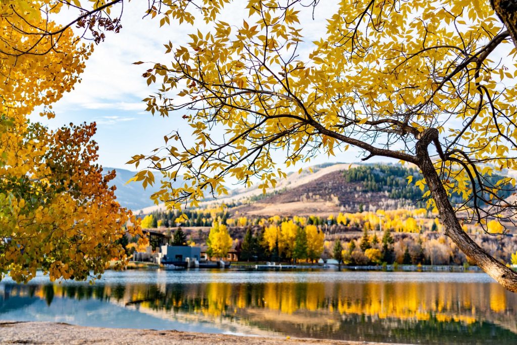 El Avon Performance Pavilion está enmarcado por hojas doradas en una mañana de otoño. Nottingham Park será el anfitrión del FreeFall Bluegrass Festival del 9 al 11 de octubre.