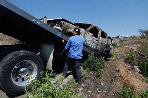 ▲ En la carretera de Tapalpa a Autlán, la población aún levanta autos dañados durante la ola de narcoviolencia desatada tras la detención de Nemesio Oseguera.Foto Víctor Camacho