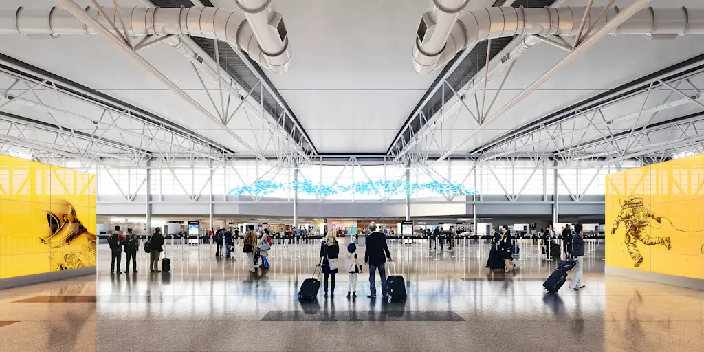 Along the wall bordering the security checkpoint at JFK’s Terminal 1, a massive split-flap display board designed by Pentagram and the engineering firm Arup will cycle through large lo-fi artworks of New York landmarks and scenery. In Houston’s Terminal E, there’s a large blown-glass artwork hanging above the checkpoint. At Dallas’s Love Field, a recent Corgan project, the line to the security checkpoint worms along a path directly beneath a huge tiled mosaic of a field of wildflowers.
