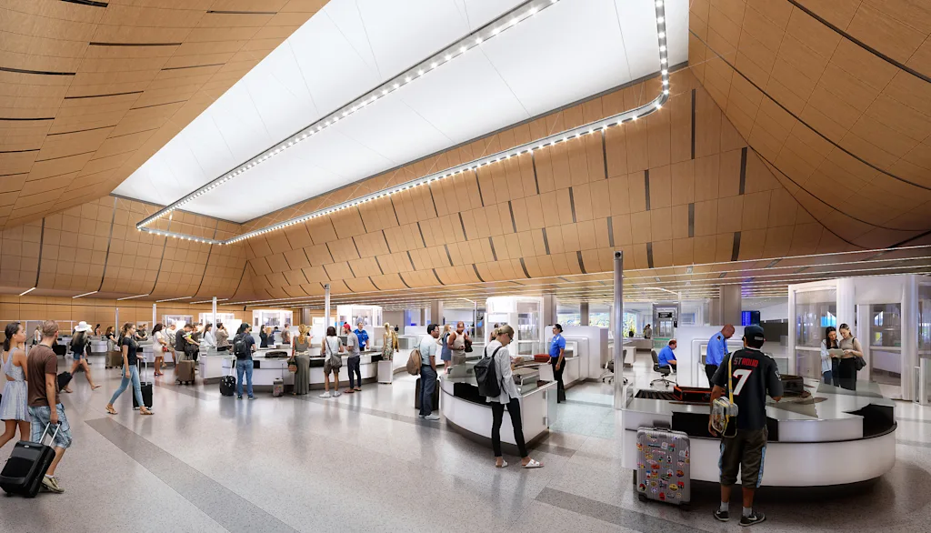 When it begins opening in phases later this year, the new Terminal 1 at JFK Airport will integrate biometric document-checking technology that could, one day, eliminate the need for human workers to manually check identification and boarding passes. “It’s taking the need of staffing for airlines down to next to none, but it’s also reduced the footprint of how much space is needed at a check-in hall,” Osbaugh says. The lines leading up to this checkpoint, he adds, can “accordion” in size depending on the size of a crowd at any given time.