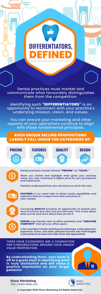 Dental practices can stand out by identifying and communicating their unique differentiators—factors that set them apart in pricing (or value), features, quality, and design. By aligning these strengths with their mission and values, practices can better convey what makes their care special. This clarity helps attract patients who appreciate the distinct value and experience the practice offers.