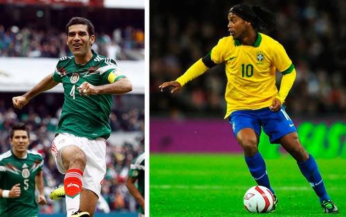 ▲ El mexicano Rafa Márquez y el brasileño Ronaldinho lideran la cartelera del duelo.Foto Cuartoscuro y @ronaldinho