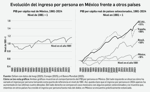 “El ingreso por persona en 2024 apenas ha aumentado en las cuatro décadas recientes. Mientras en otros países ha subido hasta más del doble, en México se encuentra prácticamente estancado”, enfatiza.