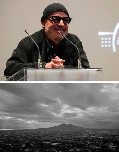▲ La retrospectiva del cineasta Gianfranco Rosi en la Cineteca Nacional, permanecerá hasta el 3 de mayo. En las imágenes, el director en sesión de preguntas y respuestas y un fotograma de su cinta Pompei, sotto le nuvole.Foto cortesía de la Cineteca Nacional / Martín Onsaya
