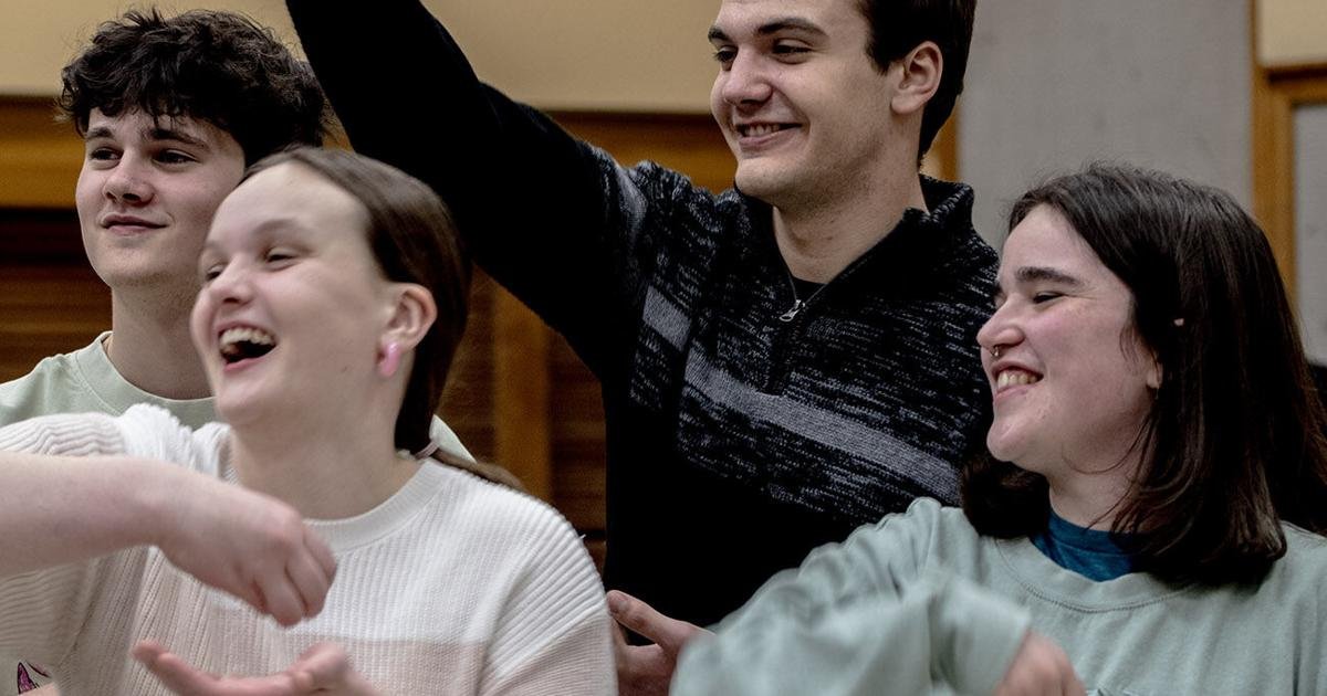 El coro “Our Town” actúa con el profesor de la Universidad de Wisconsin-Madison, Thomas Kasdorf, al piano durante los ensayos de la próxima producción de la Ópera Universitaria.