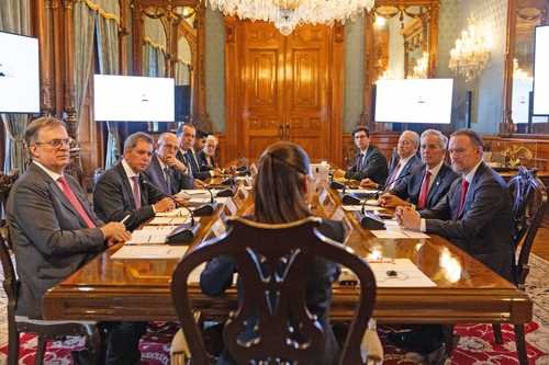 ▲ El secretario de Economía, Marcelo Ebrard (esquina izquierda), luego de una reunión en Palacio Nacional con su homólogo estadunidense, Jamieson Greer (derecha), la presidenta Claudia Sheinbaum y funcionarios del gabinete, informó que se acordó la primera ronda de negociación bilateral del T-MEC para el 25 de mayo.Foto Presidencia