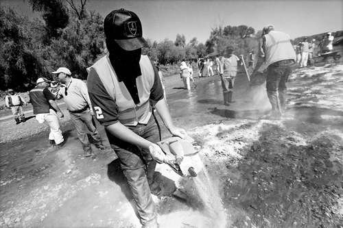 ▲ En 2014, empleados de la minera Grupo México trataron, sin resultados, de contrarrestar el daño del vertido de ácido sulfúrico.Foto Cuartoscuro