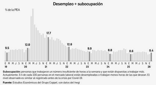 La población subocupada, es decir, aquella que tiene disponibilidad para trabajar más horas, fue de 4.2 millones de personas. La tasa de subocupación se ubicó en 7 por ciento de la población ocupada, proporción superior al 6.3 por ciento del segundo mes de 2025.