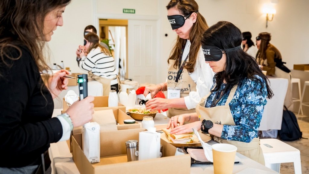 El día comenzó con el delantal en “Cocinar a ciegas”, un taller en el que los participantes se enfrentaron a la preparación de sencillas recetas valiéndose de sus otros sentidos. En grupos de 3 y dotados de antifaces, se les encomendó la misión de preparar una ensalada, un sándwich y una bebida, con el plus de dificultad de adaptar el menú a diferentes intolerancias alimentarias, como la intolerancia al gluten y a la lactosa.