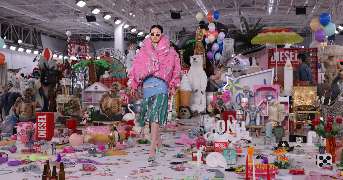 MILAN — In our Digital Dark Ages, a resurgence of dizzy stoned escapism spiked with hedonistic abandon is perhaps a natural reaction. Milan Fashion Week opened to such a mood with Tuesday’s Diesel show, where the goings were overtly sexualised — that’s creative director Glenn Marten’s signature, after all — in a wasted, post-orgasmic, morning-after kind of way.