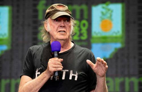 ▲ El músico canadiense Neil Young en una conferencia de prensa de Farm Aid 2023 en el Ruoff Music Center, Indiana.Foto Afp