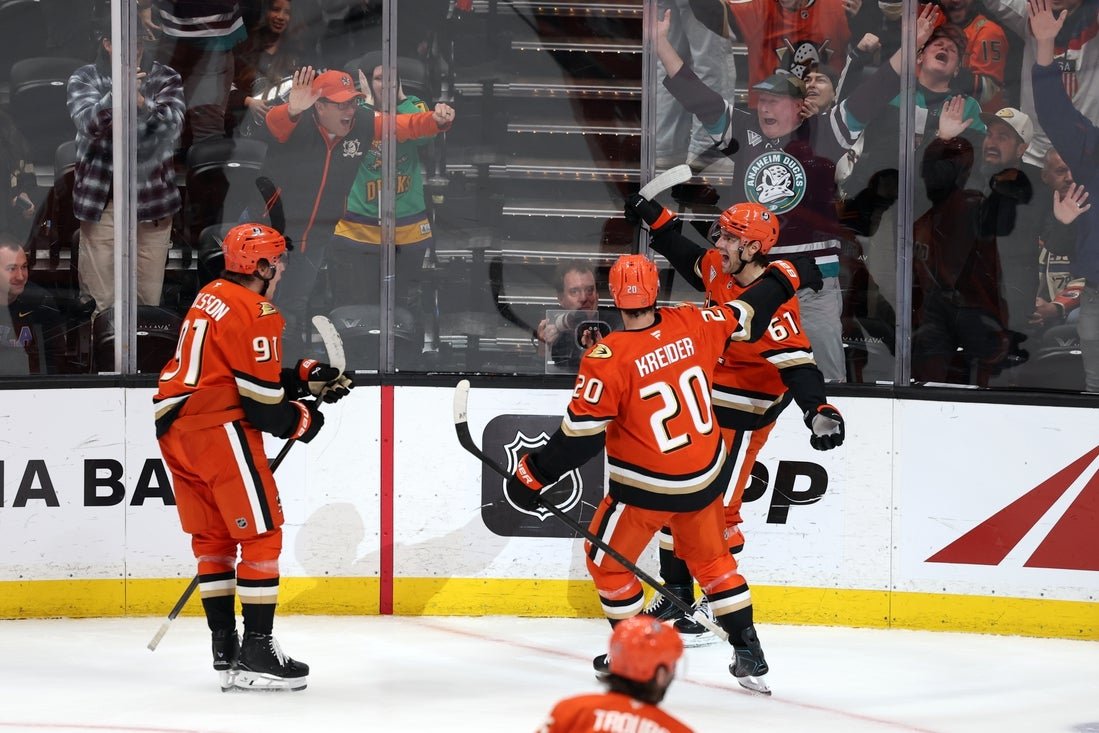 Ian Moore, Alex Killorn, Olen Zellweger and Beckett Sennecke also scored for the Ducks, who have won 10 of 12 games. Anaheim goaltender Lukas Dostal made 22 saves.
