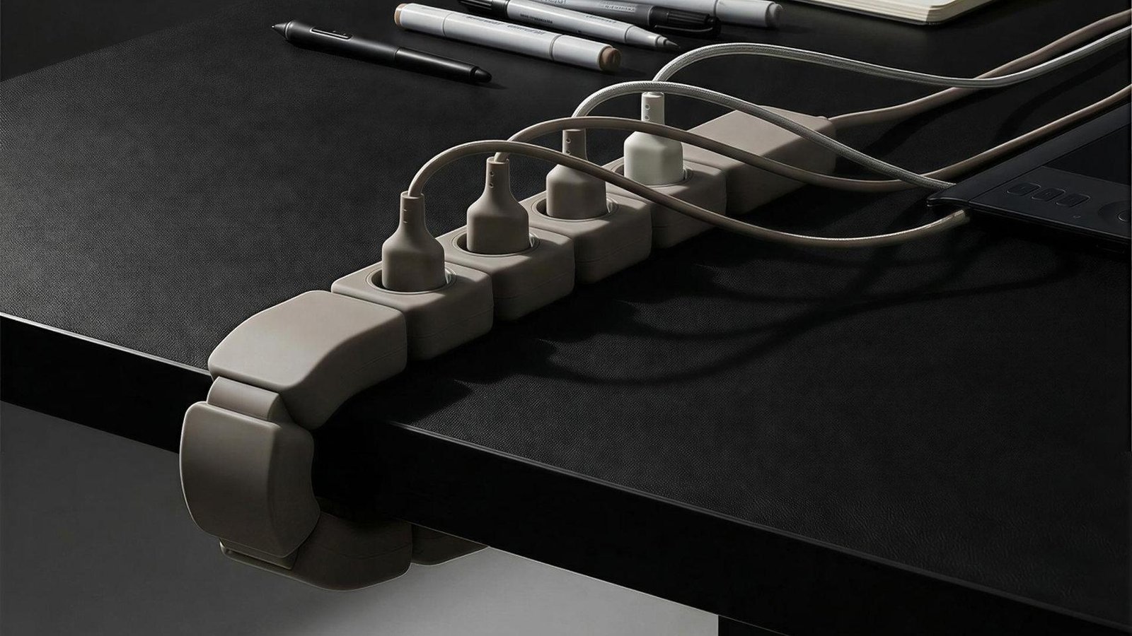 La solución de Edge consiste en usar el borde de la mesa, gracias a un diseño en forma de abrazadera que permite mantener la regleta colocada de manera segura y aprovechando tanto la parte superior como inferior de la mesa.