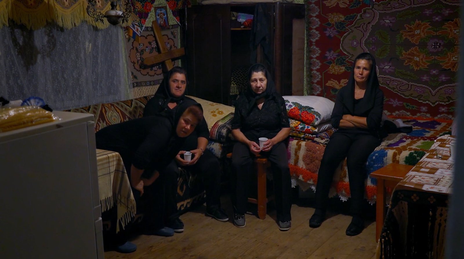 From there, Petri takes us to a house and a garden surrounding it. It is still nighttime – maybe the same night. Men are sitting outside, discussing topics like traffic and roads in Germany, while the women are inside, having their own conversations on topics closer to home. Crying and sobbing sounds in, we presume, the not-so-distant background remind us that the event that has gathered all of these people at the house is a wake, meaning that the day after will be the day of the funeral. And in villages like this one, funerals can be prime social events that bring people, many of whom have moved to cities, to other towns or abroad, together.
