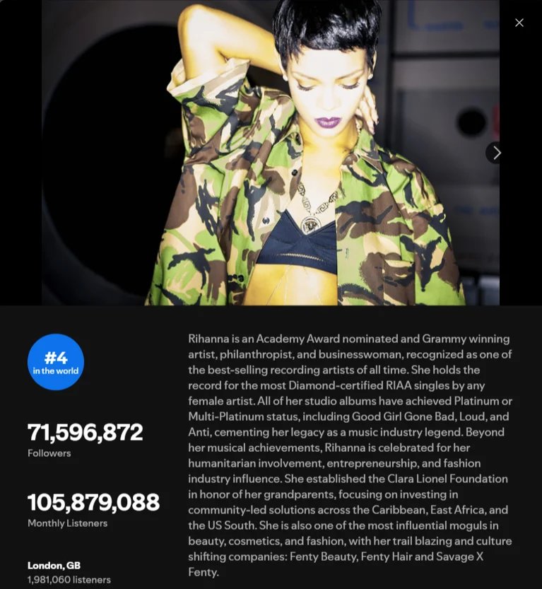 Rihanna has become the leading female musician on Spotify after achieving the highest number of listeners who use the platform each month. The milestone comes a full decade after the release of her last studio album, ‘Anti,’ in 2016. The achievement demonstrates her music remains popular among listeners during the streaming music period.