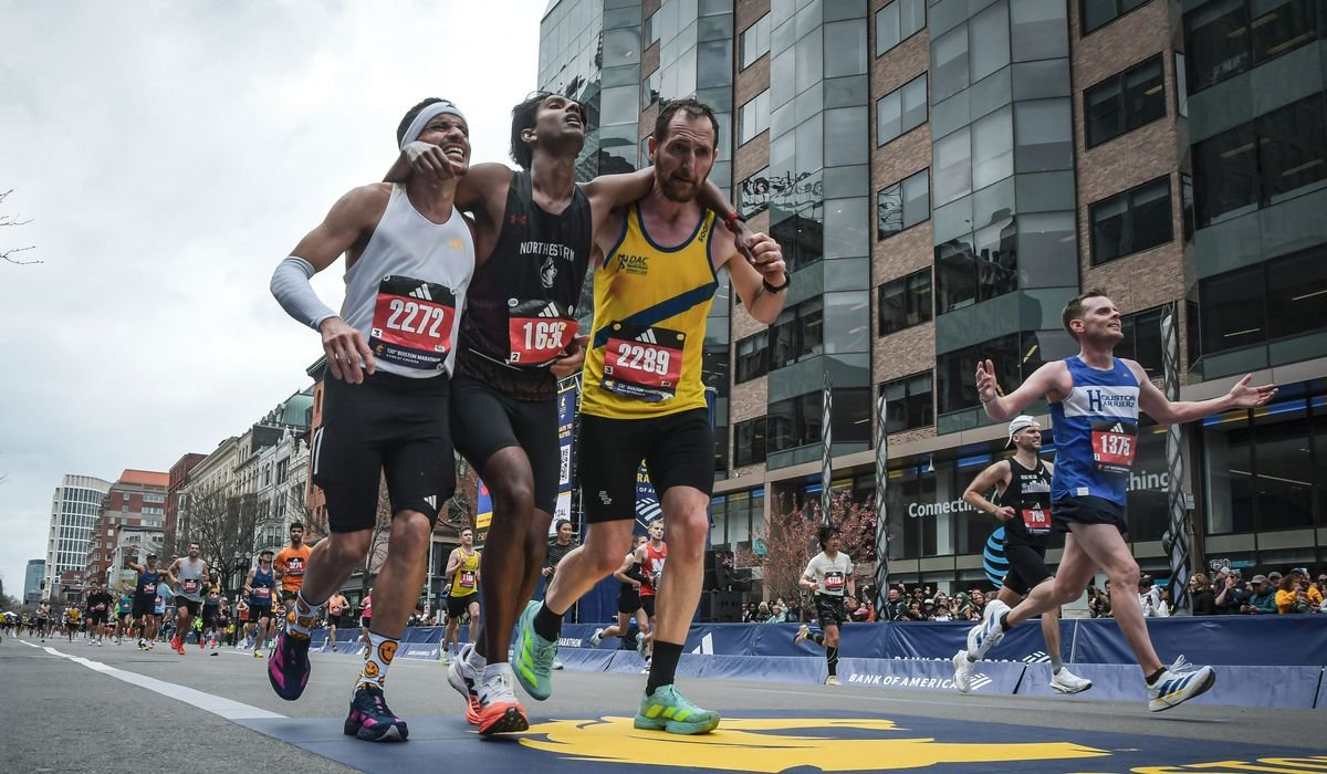BOSTON — Ajay Haridasse was close to finishing the Boston Marathon when his legs gave out. But as he struggled to get up, two other runners came along, lifted him up and helped him about 1,000 feet (305 meters) to the finish line.