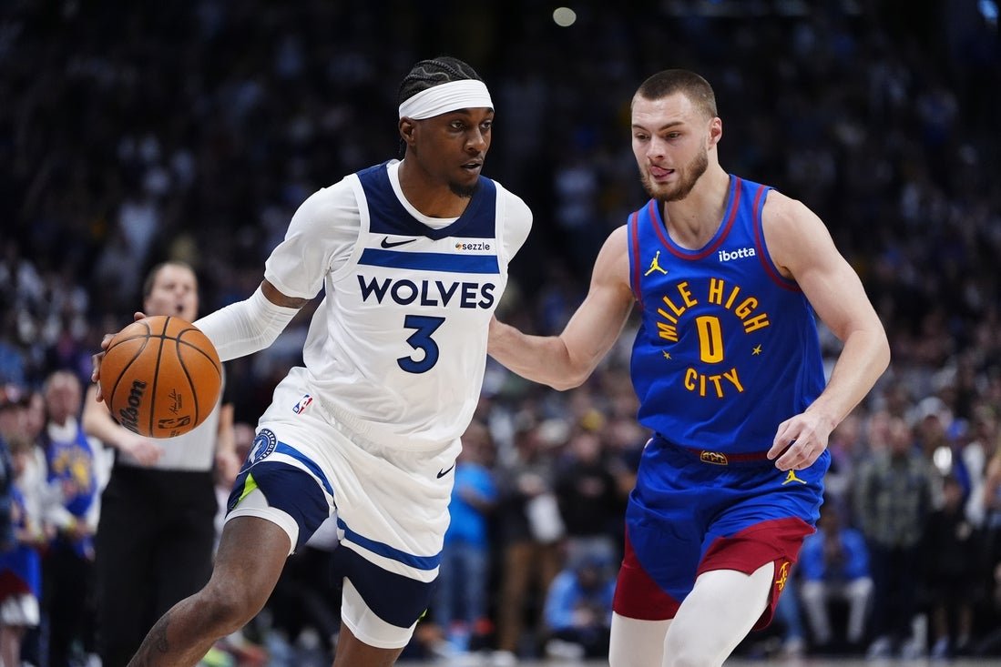 Minnesota trailed by 11 in the first quarter but scored 12 straight points in the second to take a 45-38 lead. The Nuggets tied it on Julian Strawther’s layup with 2:29 left in the period but the Timberwolves closed the half on a 12-4 run to lead 58-50 at intermission.