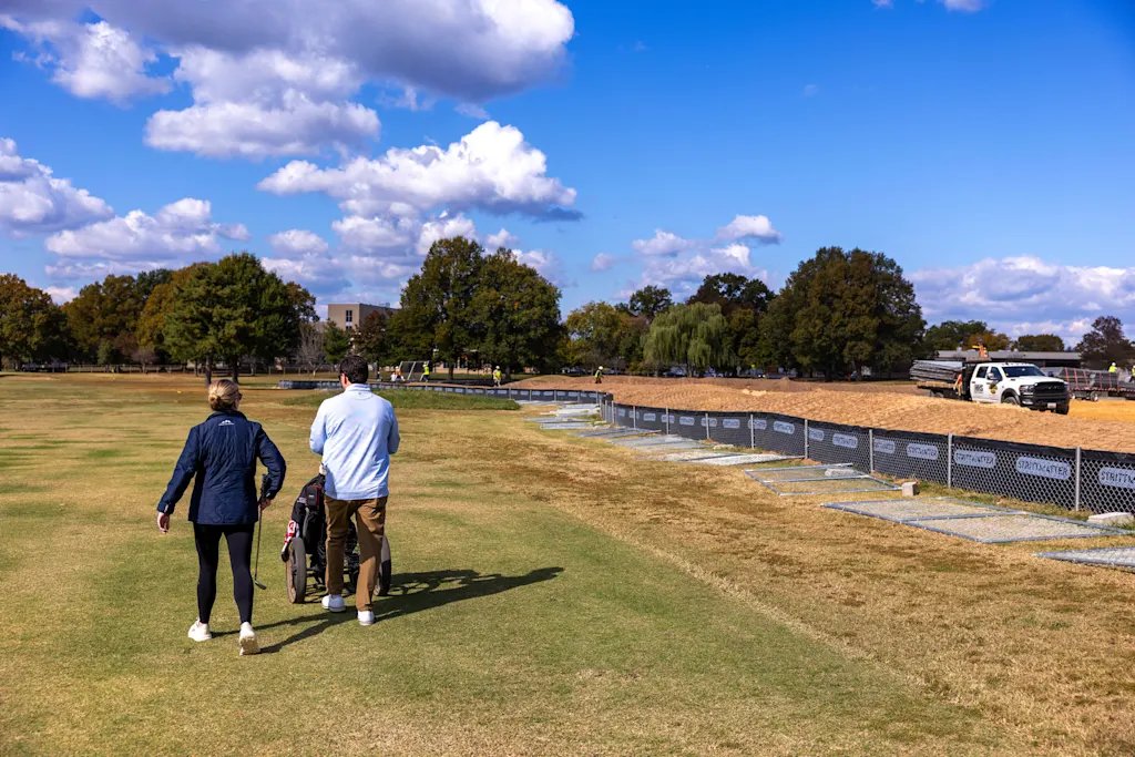 Golfers play the fifth hole as trucks unload debris and soil from the demolition of the White House’s East Wing at East Potomac Golf Course on October 24, 2025, in Washington, D.C. [Photo: Tasos Katopodis/Getty Images]