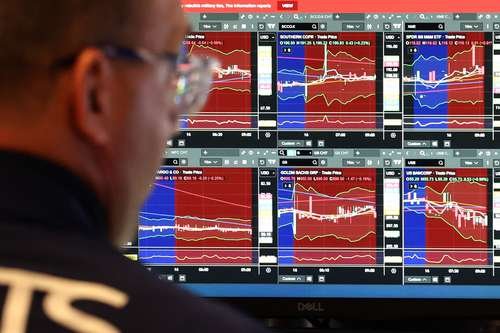 ▲ Un operador observa el comportamiento de los indicadores de la Bolsa de Nueva York al comienzo de la sesión, que concluyó con ganancias luego del anuncio de la reapertura del estrecho de Ormuz.Foto Afp