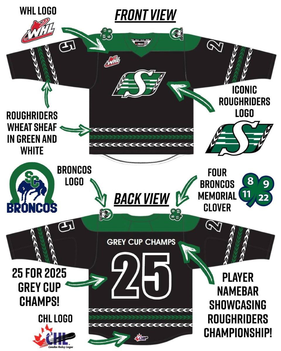 The Swift Current Broncos will be wearing new duds when they face the Moose Jaw Warriors on Friday night, paying tribute to the Saskatchewan Roughriders’ 2025 Grey Cup victory.