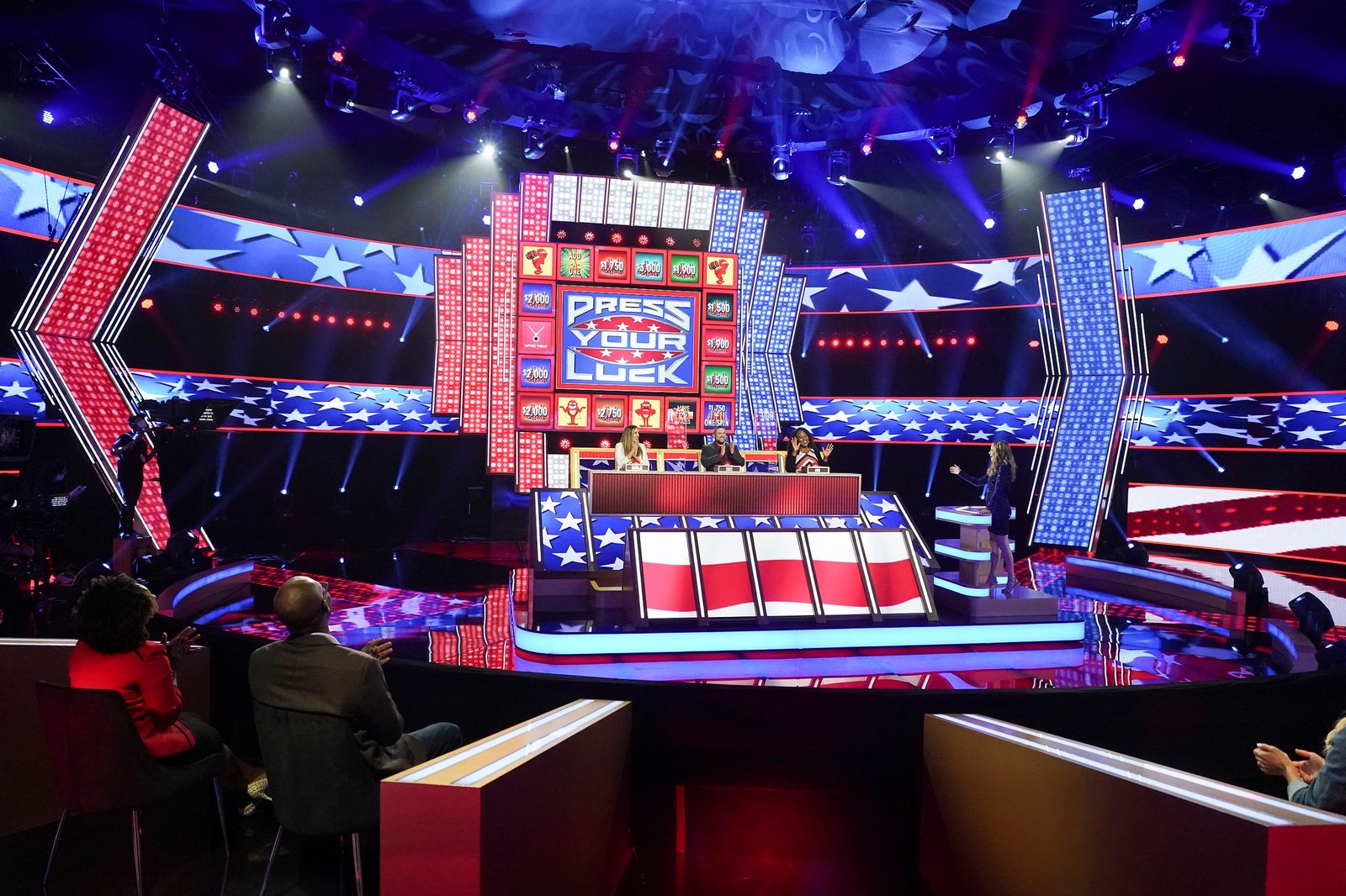 A game show airing on the ABC television network, the Press Your Luck TV series is a revival of the 1980s daytime series. Hosted by Elizabeth Banks, the show features contestants squaring off to answer questions in a game of wits, strategy, and high stakes. During each game, three contestants compete against each other by answering questions to earn spins on the Big Board. Contestants then use their spins to win cash and prizes while trying to avoid the WHAMMY, who could take all of their winnings and leave them with nothing. The winning contestant moves on to the bonus round to face the WHAMMY in a final battle for the chance to win a million dollars.