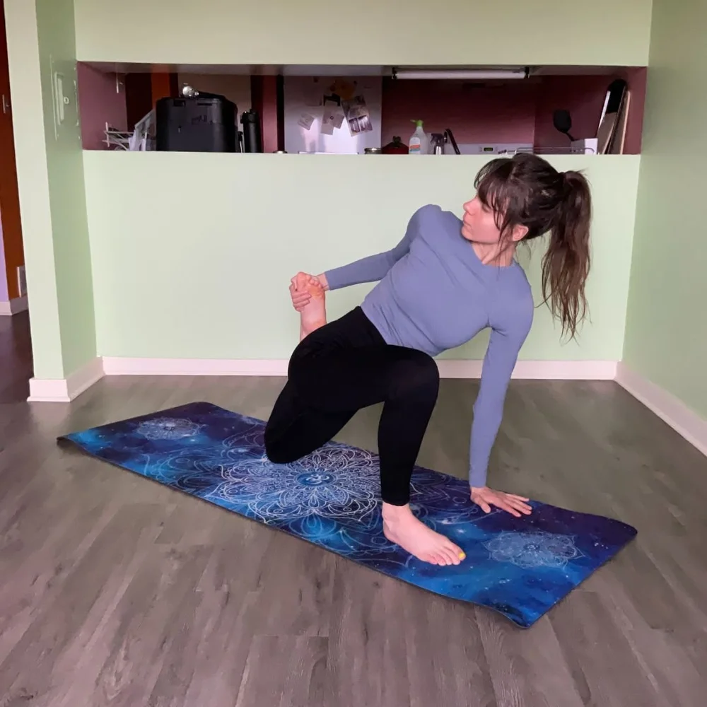 Corkscrew is one of my favorite poses to stretch my quadriceps. This pose is a simple transition from the Wide-Angle Lunge, stretching the back legs, quadricep, and knee muscles. This pose engages the hip extensors while stretching the hip flexors. It also engages the hamstrings when flexing the knee and the quadriceps as you kick your leg back into your hand or glutes.