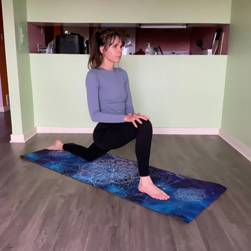 From Garland Pose, twist to the Left and place your back knee on the floor with your front foot forward. Uncurl the toes and move the hips forward to ensure your pelvis is square with the Body. You can Place your hand on top of your knee or the floor.